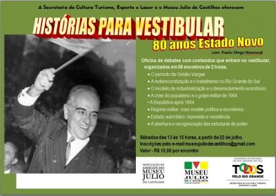 Para quem irá fazer vestibular ou Enem, o museu Julio de Castilhos está oferecendo uma boa oportunidade de ensino. Está sendo realizada a oficina de debates Histórias para vestibular com Paulo Diego Navossat, que, a partir dos contextos históricos do próprio acervo, irá abordar tópicos relativos aos 80 anos do período marcado pelo Estado Novo no Brasil.