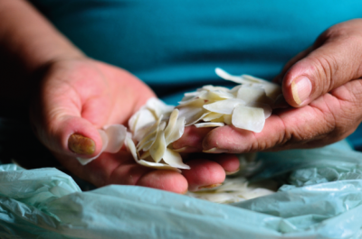 Cada rede de pescar camarão é usada pelo pescador por mais ou menos cinco safras, período no qual ela fica na água e no sol por várias horas, sofrendo desgaste e danos. Quando chegam em um estado que não vale mais a pena serem consertadas, Jair Soares, 48 anos, e outros pescadores da região jogam as redes nos fundos da casa, na rua ou até mesmo na beira da praia. Assim, por muitos anos, ao passear pela Colônia, era possível encontrar elas enroscadas, lonas descartadas pelo caminho e couro e escamas dos peixes jogados no lixo. Mas o cenário mudou quando sua esposa, Karine Soares, 43 anos, junto com outras mulheres da Colônia resolveram recolher esses restos.