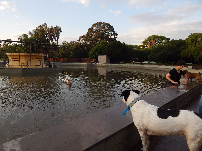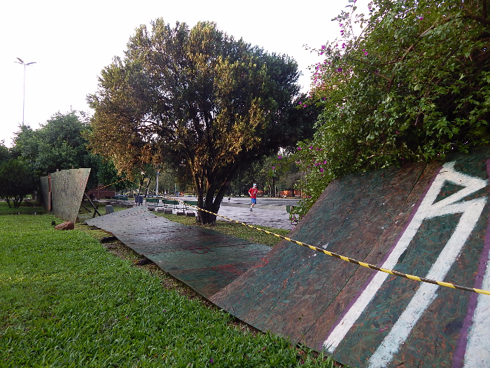Além das árvores, o temporal derrubou mais da metade dos tapumes que isolam a área do eixo central do Parque Farroupilha. As obras do eixo e do espelho d’água já estão prontas, falta a reforma da fonte luminosa. Esta foi uma rara boa notícia para os frequentadores do parque. Depois de quase um ano sem ter acesso ao chafariz, os “cachorreiros” aproveitaram o sol que abriu no final da tarde para passear com os animais de estimação. E os cães aproveitaram para brincar no chafariz, parcialmente cheio pela água da chuva.