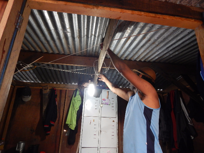 A casa é feita de compensado com telhas metálicas e serve de vestiário para os funcionários da obra e de abrigo para os guardas da noite. Hoje o cabide voltou a ter vários casacos e bolsas. Com a queda dos tapumes da obras, a empresa responsável, a Torke Engenharia, precisou deslocar funcionários para recolocar o isolamento.