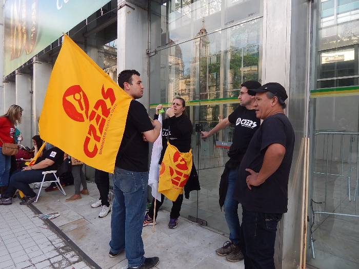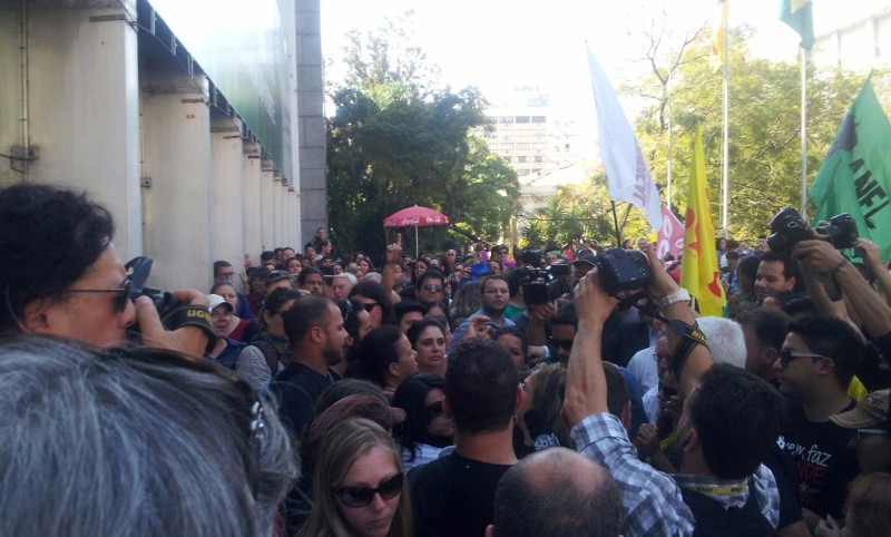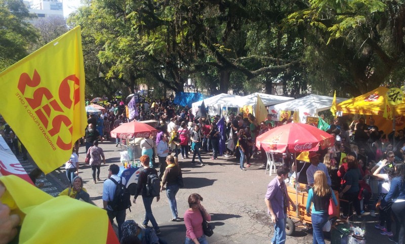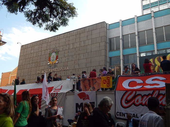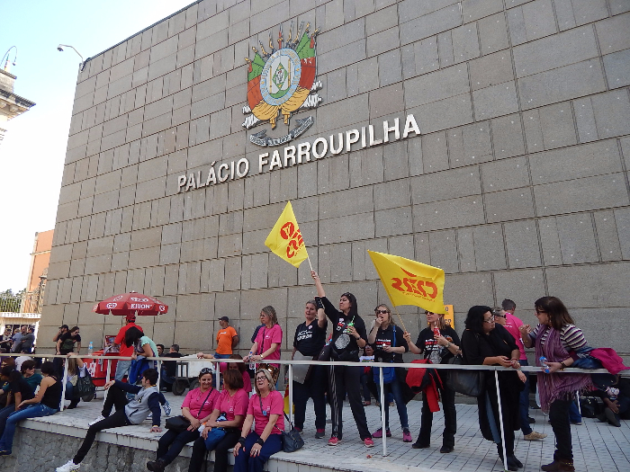 Servidores públicos estaduais concentraram-se desde as 7h da manhã desta terça-feira em frente as duas entradas principais da Assembleia Legislativa do Rio Grande do Sul para impedir que os deputados votassem os projetos que integram o pacote de ajuste fiscal do governo de José Ivo Sartori, principalmente os três projetos protocolados em regime de urgência: a criação do regime de previdência complementar, que limita as aposentadorias dos servidores ao teto do INSS, e a extinção das fundações estaduais de Produção e Pesquisa em Saúde (Fepps) e do Esporte e Lazer do Rio Grande do Sul (Fundergs).