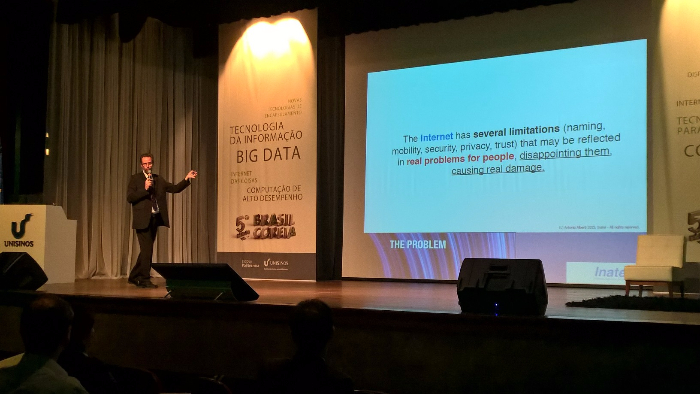 A abordagem da NovaGênesis para uma Internet do futuro, explorando os benefícios na área da saúde, foi o tema da palestra do professor adjunto do Instituto Nacional de Telecomunicações (Inatel), um centro de excelência em ensino e pesquisa na área de Engenharia, de Minas Gerais, Antonio Alberti, mestre e PhD pela Unicamp e por um ano pesquisador visitante no ETRI, na Coreia do Sul. Hoje, Alberti é arquiteto chefe do projeto de Tecnologias de Comunicação e Informação (ICT) Convergente NovaGenesis.