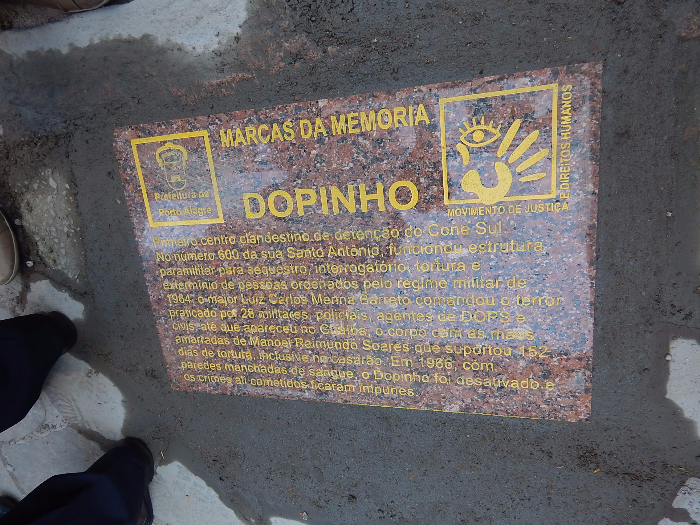 Foi descerrada a placa que identifica a antiga sede do Dopinha como aparelho repressivo da ditadura militar. A cerimônia ocorreu na tarde desta quarta-feira, coordenada pelo presidente do Movimento de Justiça e Direitos Humanos, Jair Krischke. O secretário municipal de Direitos Humanos, Luciano Marcantonio, o suplente de senador Cristopher Goulart, neto do ex-presidente da República, João Goulart, e alguns ex-militares, prestigiaram o ato.