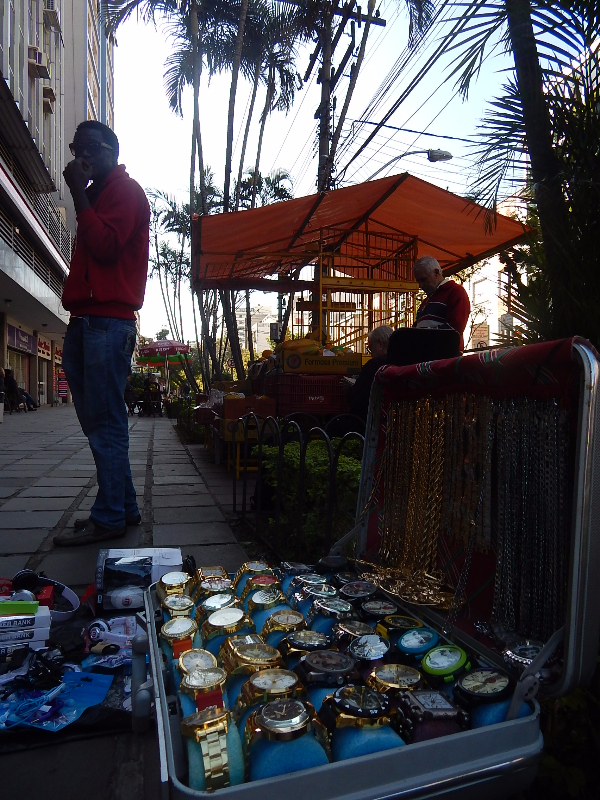 Na esquina da Osvaldo com a Felipe Camarão, outro imigrante senegalês vende relógios, bijuterias e fones de ouvido. Mamouth Baye tem 26 anos e está na cidade há um ano. Saiu do Senegal sozinho, passou pela Espanha, São Paulo e chegou a Porto Alegre. A maior parte da família ficou no país, mas ele conta que tem um irmão vivendo no Canadá e outro na Itália. O motivo da migração é quase sempre o mesmo: no Senegal não tem trabalho. Mamouth achava que no Brasil a coisa seria um pouco mais fácil, mas reconhece: “em todo lugar tem crise.”