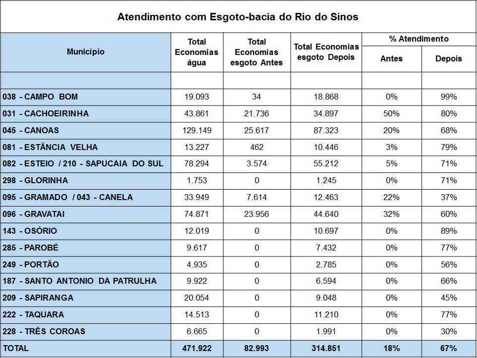 Tabela da situação de água e esgoto em municípios do Sinos: