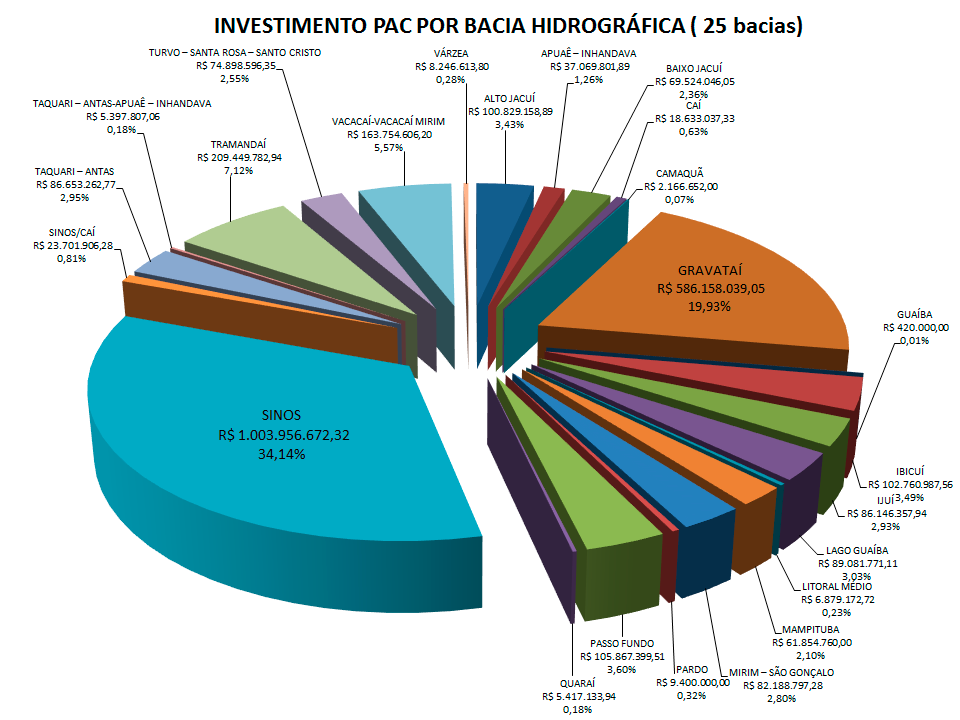 Excluídas as cidades de Novo Hamburgo e São Leopoldo, que possuem serviços municipais de abastecimento de água e esgotos, a Corsan tem projetos concluídos em vários municípios, mas, sem obras em andamento por falta de recursos do PAC II. Em alguns casos, obras foram tocadas com recursos próprios ou obtidos junto ao BNDES ou ao FGTS; em outros mais, há redes de esgoto concluídas nas ruas mas não ligadas pelos usuários potenciais. “O fundamental no momento é ligar a rede”, disse Marcon, lembrando que, no momento, ninguém está sendo cobrado pela disponibilidade do serviço de esgoto. É na bacia do Sinos que se concentram os investimentos da Corsan, conforme uma “pizza” apresentada por Marcon.