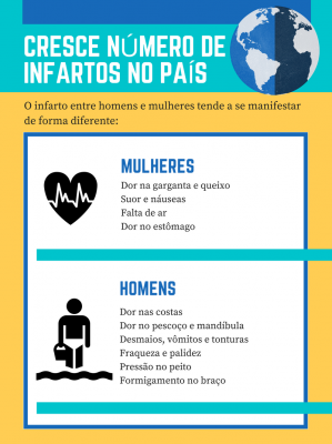 O número de doenças cardiovasculares aumentou no país para as mulheres. Cerca de 30% dos casos de infarto têm o sexo feminino como vítimas. Segundo informações da Campanha Coração Alerta, o coração delas é menos, as artérias coronárias são mais estreitas e a frequência cardíaca de repouso maior, ou seja, o coração é mais acelerado.
