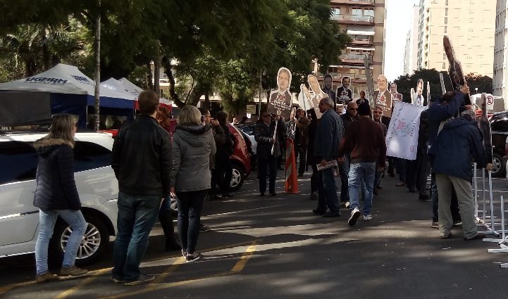 Portando faixas e cartazes, com as fotos dos deputados que aprovaram o projeto de Lei apresentado pelo Governo do Estado, servidores de cinco fundações estaduais realizaram hoje uma caminhada, do Largo Glênio Peres ao Palácio Piratini, para lembrar o dia 20 de dezembro do ano passado, quando a Assembleia Legislativa autorizou a extinção de nove fundações estaduais e uma autarquia.