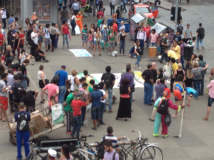 Era o ápice do ato político organizado pelos coletivos contrários ao modelo de revitalização proposto para a antiga área portuária da cidade, que inclui a restauração dos armazéns tombados pelo patrimônio histórico e a construção de três espigões, um shopping center e estacionamento para 4 mil veículos.