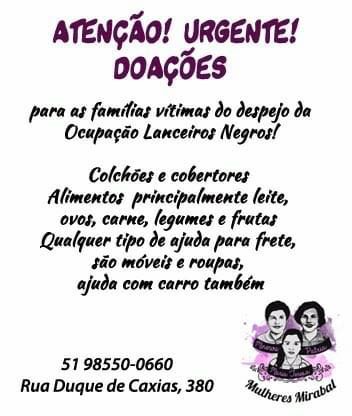 A Mirabal, na avenida Duque de Caxias, 380, está recebendo doações para as famílias despejadas: colchões e cobertas, e comida: especialmente leite e alimentos perecíveis para uso imediato (ovos, carne, legumes e frutas).
