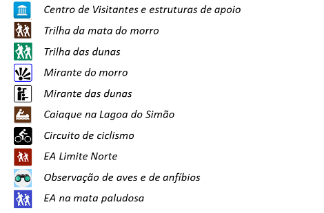 As atividades projetadas para o parque envolvem o contato com a natureza e a educação ambiental, através de trilhas na mata e nas dunas, caiaque na Lagoa do Simão e ciclismo, observação de aves e anfíbios, um centro de visitantes equipado com material educativo, mirantes – de onde é possível ter uma visão do sistema costeiro local e da cidade de Torres, ao fundo – e estabelecimentos comerciais.