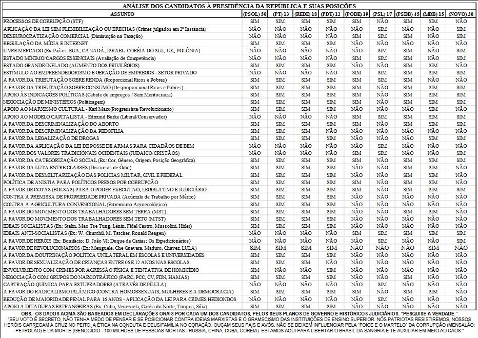 Não é mencionado nome de candidato, mas no rodapé do quadro comparativo o aviso: “Não tenha medo de se posicionar contra ideias marxistas e o gramscismo das instituições de ensino superior”, diz parte do texto, que segue com outras citações.