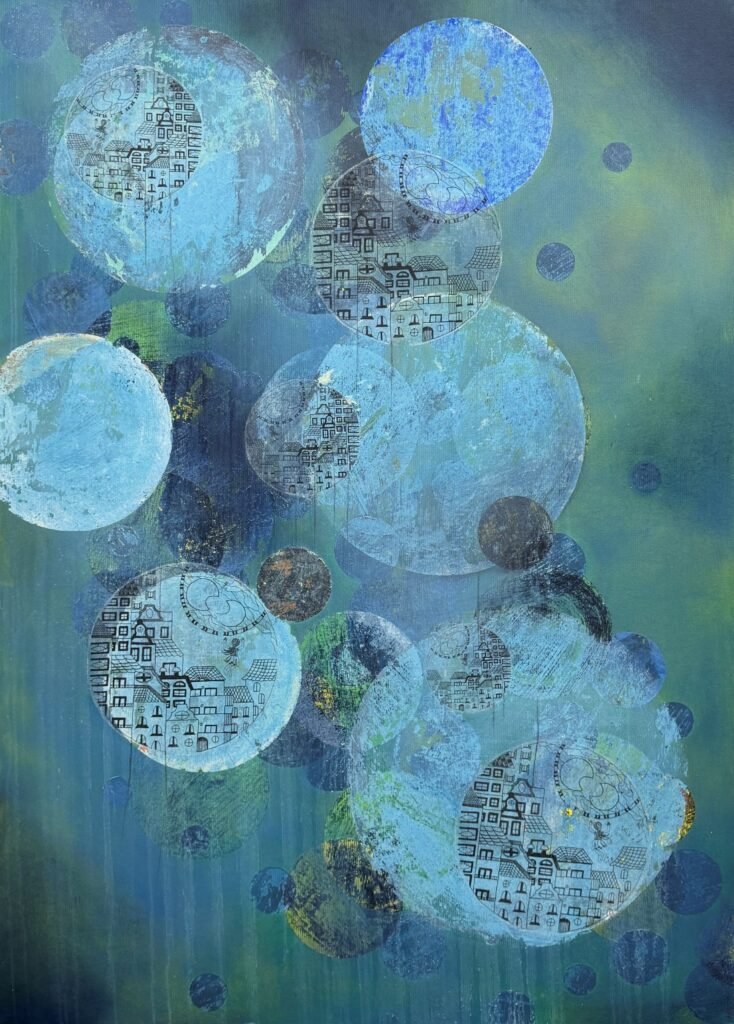 De acordo com a curadora, Muitos Mundos surge a partir de uma pergunta simples: O que é realidade? Pensando na teoria ontológica de realidades ramificadas, a artista busca pelo cerne, ou como ela afirma, o ‘mundo principal’, diante da pluralidade de universos singulares simbolizado por esferas evidenciadas em suas pinturas e monotipias.