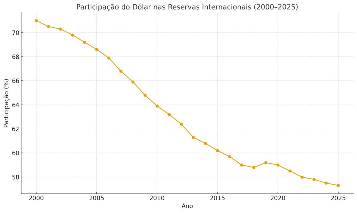 O uso do dólar nas reservas internacionais caiu de cerca de 71% em 1999 para 56,3% em 2025. A China, Rússia, Índia e países do Golfo têm ampliado liquidações em moedas locais, especialmente em comércio de energia. A expansão de ativos digitais e stablecoins também cria rotas financeiras fora do sistema bancário tradicional baseado no dólar.