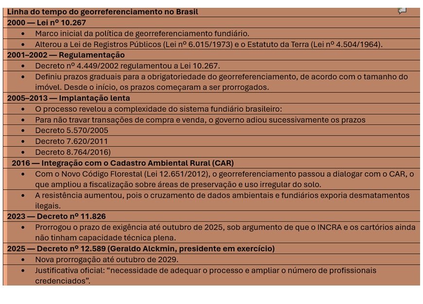 Desde o ano 2000 (Decreto 4.449/2002, INCRA, Lei 10.267) o georreferenciamento foi implantado no Brasil, e os prazos vêm sendo sucessivamente prorrogados, o que ajuda a entender o poder político de proprietários de terras, que muitas vezes resistem ou tentam ocultar informações sobre suas propriedades georreferenciadas por uma série de motivos econômicos, fiscais e até políticos.