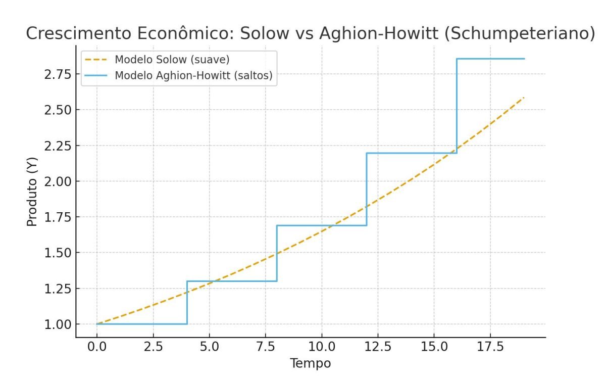 Em 1992, Aghion e Howitt formalizaram matematicamente a narrativa de Schumpeter. Eles criaram um modelo matemático endógeno, ou seja, o crescimento vem de dentro da economia, no qual o motor no longo prazo não é apenas o acúmulo de capital ou trabalho, mas sim a inovação, gerada por Pesquisa e Desenvolvimento (P&D).