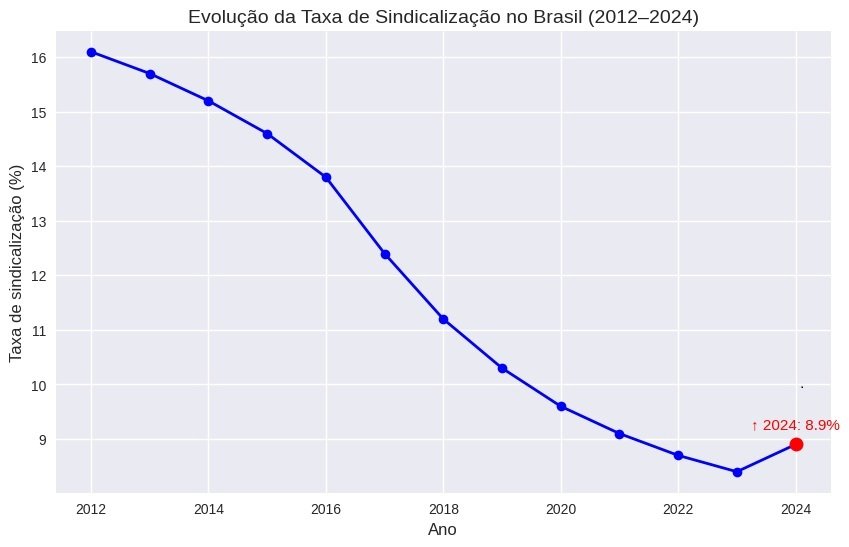 Em 2024, houve um aumento na taxa de adesão à sindicatos entre os 101,3 milhões de ocupados no mercado de trabalho do país, o que não acontecia desde 2012. A taxa de sindicalização apresentou o primeiro resultado positivo da série histórica, passando de 8,4% (8,3 milhões de pessoas), em 2023, para 8,9% (9,1 milhões de pessoas), o que representou um acréscimo de 812 mil sindicalizados até o ano passado, interrompendo a sequência de reduções tanto de contingente (desde 2014) quanto de percentual (desde 2016). O Sul e o Sudeste puxaram o aumento de sindicalizados.
