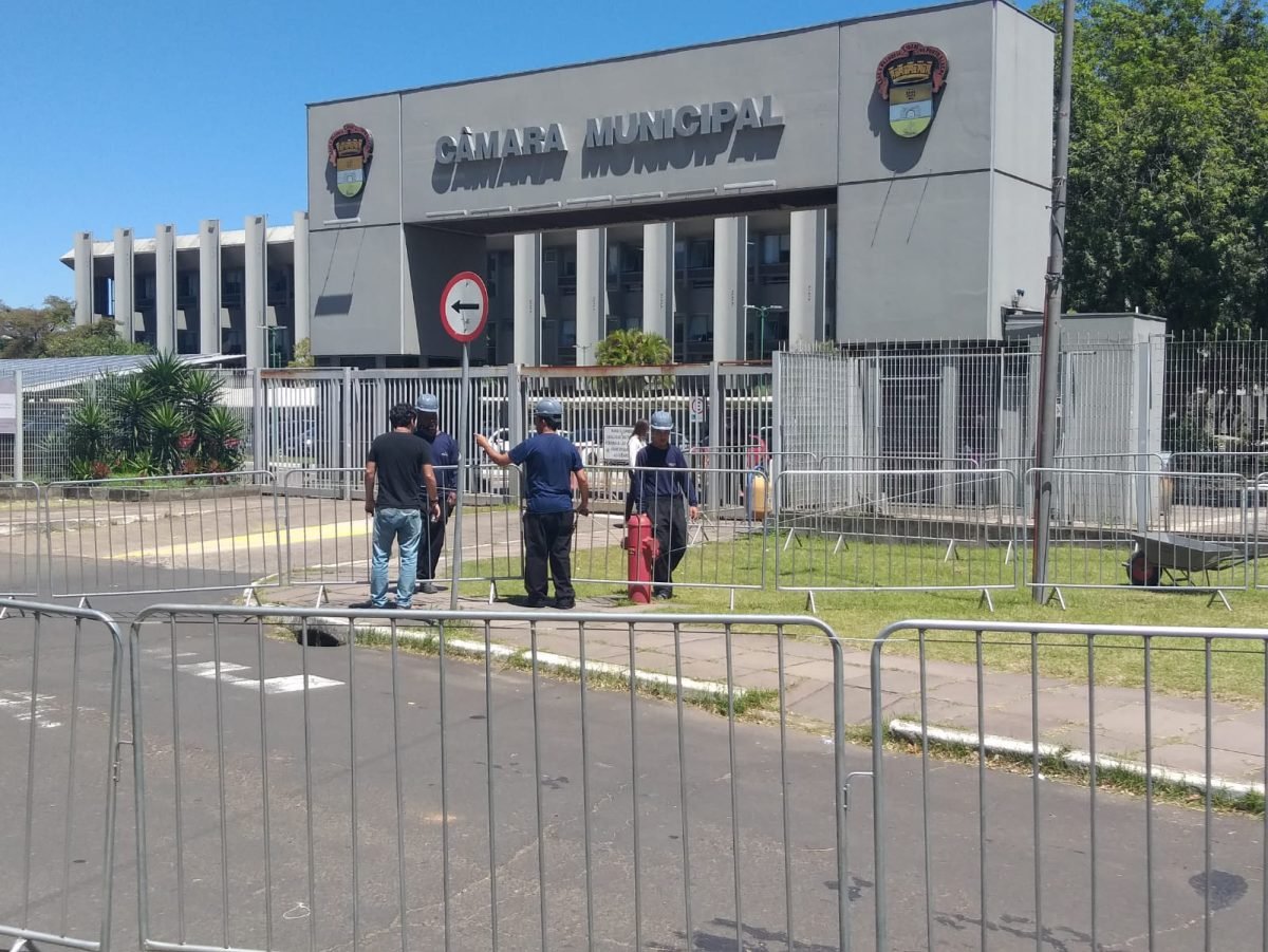 Quando chegaram os primeiros manifestantes, por volta das dez horas da manhã, a Câmara Municipal de Porto Alegre já estava cercada com barreiras metálicas que impediam a entrada de veículos e pessoas.